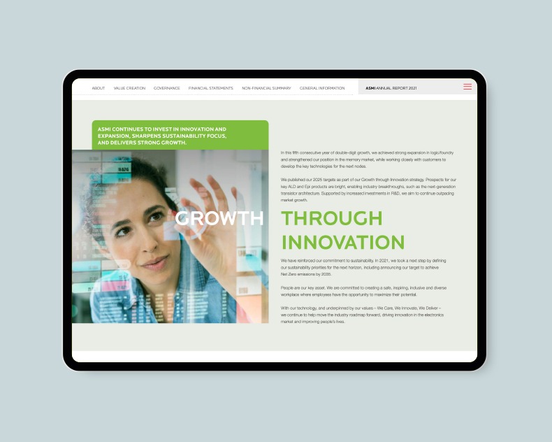 The 2021 report’s theme reflects ASMI’s drive to invest in innovation and expansion, sharpen sustainability focus, and delivering strong growth. With ASMI’s people as key asset.