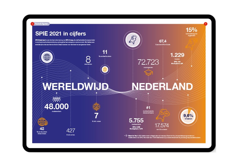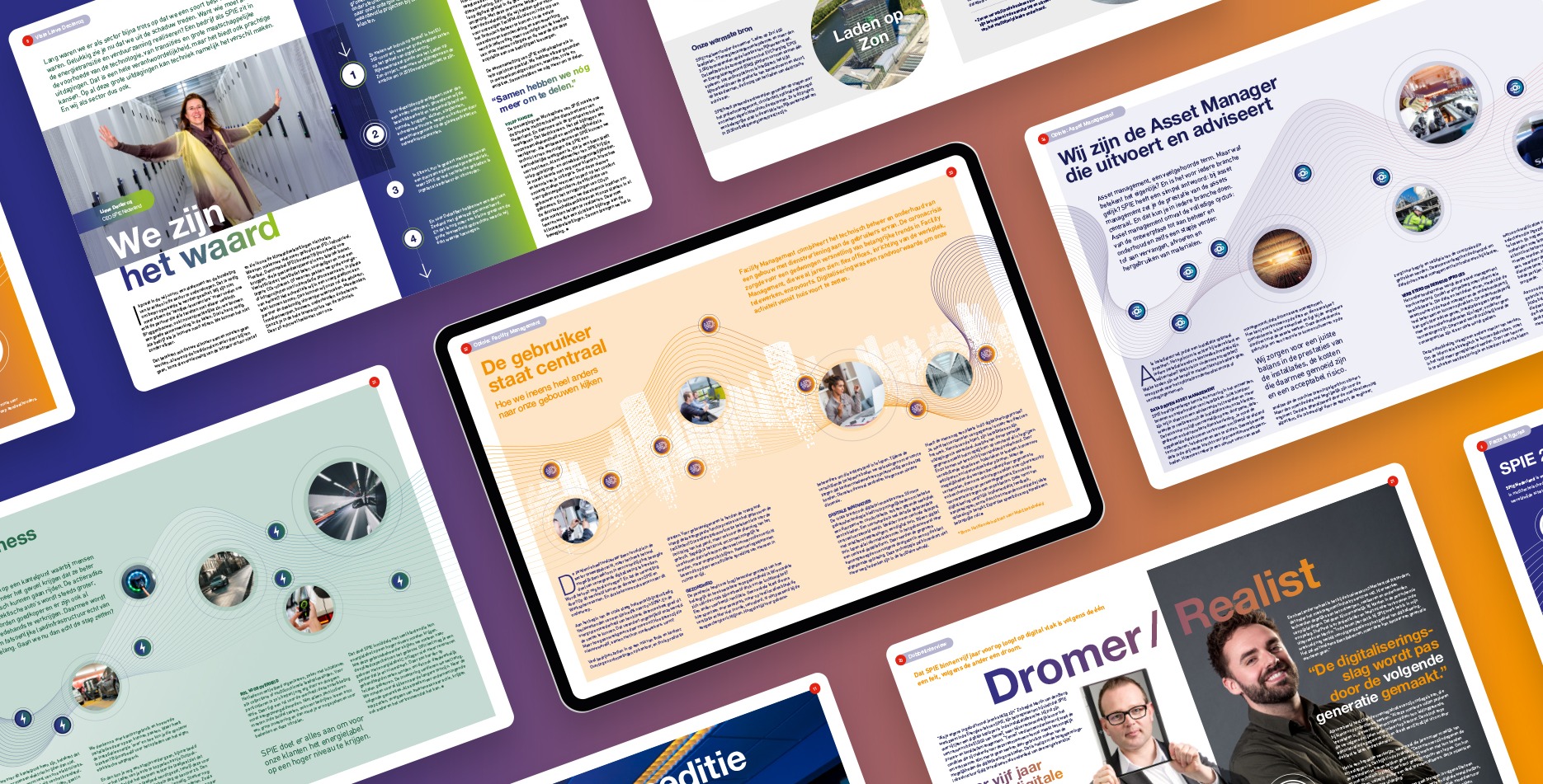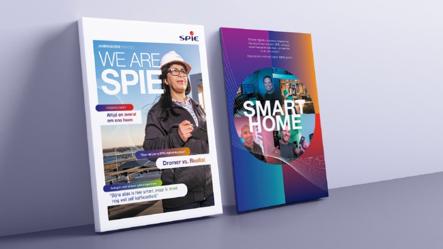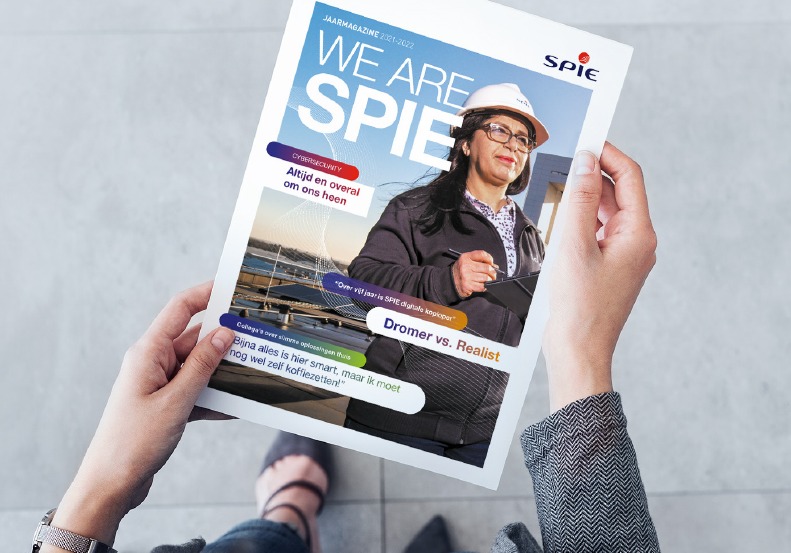 SPIE wanted the 2022 annual magazine to highlight the realization of the company’s future-proof strategy to be ‘unmistakably green’ across the organization, focusing on digitalization of processes and equipment where necessary. Therefore, this year's annual magazine is carrying ‘Digital' as a theme. Loads of employee interviews, client projects, development support and milestones are to be found in this magazine, of which 7.000 sustainable-printed copies have been shipped to all Benelux' employees.