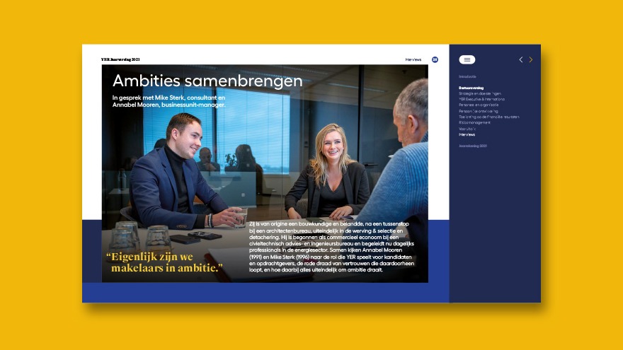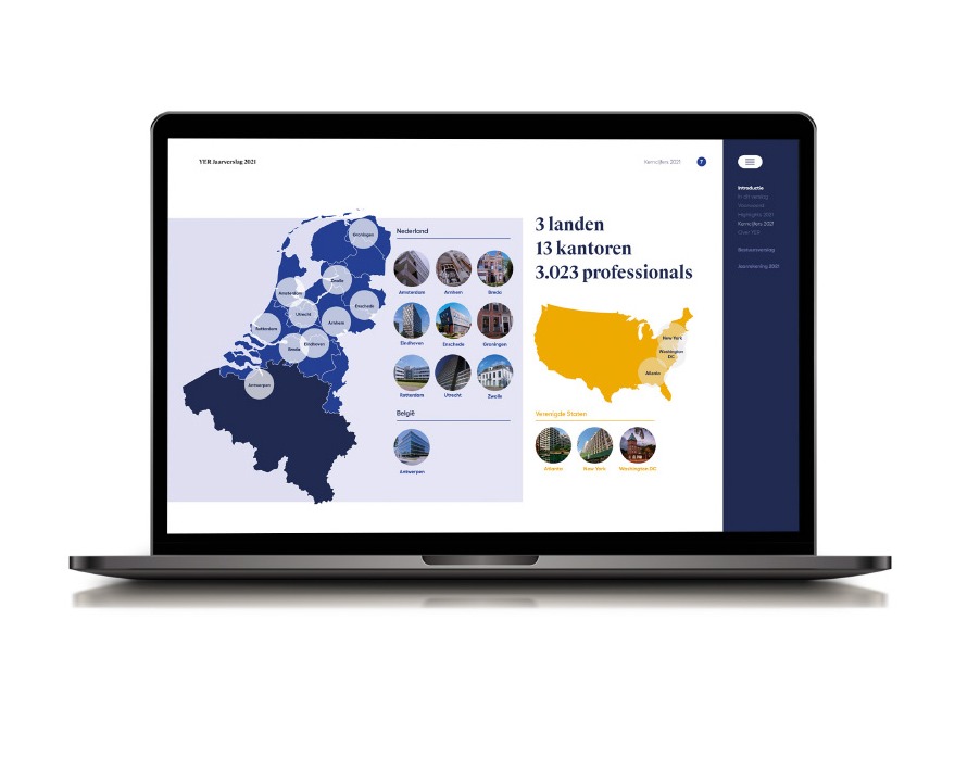 DartGroup was entitled this year to embed YER’s latest brand refresh within the annual report. The impact of this roll-out is visualized by a moving forward, landscape setup (with a side navigation bar in the digital version), a new enriched color palette and photography that is fully dedicated and centered around YER’s team itself.